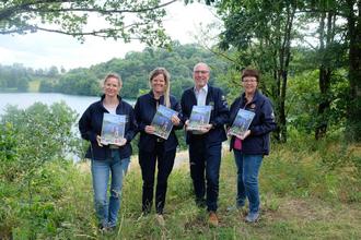 Die Geschäftsstelle der Natur- und Geopark Vulkaneifel GmbH; v.l.n.r.: Julia Franzen, Aufsichtsratsvorsitzende Landrätin Julia Gieseking, Geschäftsführer Dr. Andreas Schüller, Martina Müller geben das neue Vulkaneifel Magazin zur Veröffentlichung frei