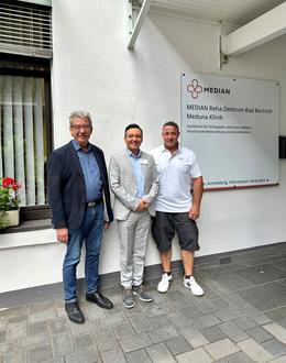 Bürgermeister Alfred Steimers und Ortsbürgermeister Christian Arnold, haben die MEDIAN Klinik in Bad Bertrich besucht, um sich ein Bild vom Schulcampus für internationale Physiotherapeuten zu machen und über aktuelle Herausforderungen zu sprechen. Begrüßt wurden sie vom kaufmännischen Leiter der Klinik, Herrn Vitali Morosow, der einen umfassenden Einblick in die aktuelle Entwicklung und das Ausbildungsprojekt gab.