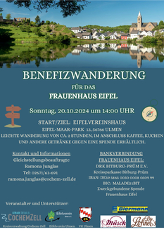 Das Frauenhaus Eifel wird im November 2024 eröffnet und bietet Platz für bis zu zehn betroffene Frauen und ihre Kinder. Der Erlös der Benefizwanderung kommt vollständig dem Frauenhaus Eifel zu Gute, um Spielsachen und Bastelmaterialien für die Kinder zu erwerben sowie Ausflüge und Aktivitäten zu finanzieren und damit traumatisierte Kinder und Mütter zu stabilisieren.