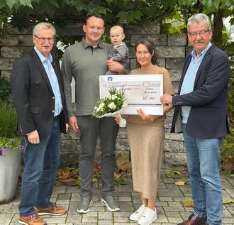 Bürgermeister Alfred Steimers und Kreisbeigeordneter Siegfried Niederelz überreichten den stolzen Eltern Veronika und Oleg Dworezki das Patengeschenk vom Bundespräsident für ihre Tochter Melina.