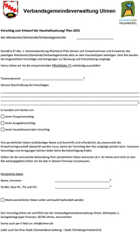 Vorschläge zum Entwurf der Haushaltssatzung, des Haushaltsplans und seiner Anlagen können innerhalb einer Frist von 14 Tagen ab dieser Bekanntmachung durch die Einwohner der Verbandsgemeinde Ulmen bei der Verbandsgemeindeverwaltung Ulmen, Finanzabteilung, Marktplatz 1, 56766 Ulmen bzw. per E-Mail unter info@ulmen.de anhand der angefügten Vorschlagsliste eingereicht werden.