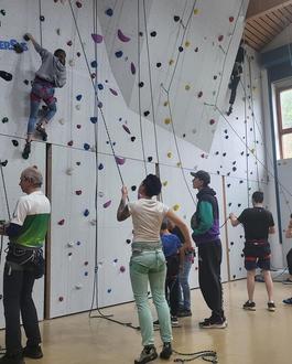 Wer hoch hinaus will, hat seit letztem Oktober im Jugendzentrum in Steineberg die Gelegenheit dazu. Nach einer langwierigen Planungszeit, die bereits 2014/2015 begann, konnte am 15. Oktober 2022 endlich die neue Indoor-Kletterwand im Jugendzentrum Steineberg eröffnet werden. Damit bietet die 8,50 m hohe und 10 m breite Kletterwand nicht nur eine Gelegenheit für Fans dieser Trendsportart, ihr Können zu verbessern, sondern ist gleichzeitig auch die 1. Indoor-Kletterwand in der Vulkaneifel! Neben der Haupt-Kletterwand beherbergt das Jugendzentrum noch eine 16 m² große „bekletterbare Dachfläche“ im Dachgiebel sowie eine 15 m² große Boulderwand. Auf 21 Routen, die Namen wie „Sparsamer Schwabe“, „die Waldfee grüßt“ oder „Daumennuckeln hilft nicht“ tragen, können sich Kinder, Jugendliche und Erwachsene an unterschiedlichen Schwierigkeitsgraden von 3 - 8 ausprobieren.
