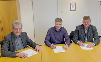 Bürgermeister Alfred Steimers, Thomas Jüngling von der Deutschen Telekom für GlasfaserPlus und Stadtbürgermeister Thomas Kerpen unterzeichnen gemeinsame Erklärung zum Glasfaserausbau