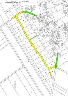 | c) | beginnt an der bereits bestehenden Gemeindestraße Flur 8 Nr. 133 (Wiesenstraße), verläuft über einen Teil der Straßenparzellen Flur 6 Nr. 20 und Flur 8 Nr. 133. Sie endet nach 62 m an der Einmündung Flur 6 Nr. 2/50 mit dem Übergang in den Wirtschaftsweg Flur 6 Nr. 20. |