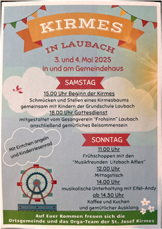 hiermit lade ich euch herzlich zur diesjährigen Kirmes ein. Durch den Gesangverein Frohsinn Laubach in Zusammenarbeit mit der Frauengemeinschaft Laubach wird auch dieses Jahr dieses Ereignis wieder ermöglicht und wir können gemeinsam ein paar fröhliche Stunden verbringen. Um die Aufgaben auf mehrere Schultern zu verteilen, werden gerne noch hilfsbereite Hände gesucht. Wer also zum Beispiel beim Auf- und Abbau am Freitag oder Montag, oder auch bei anderen Thekendiensten helfen möchte und so die Dorfgemneinschaft unterstützt, ist gerne willkommen. Bitte meldet euch unter der Telefonnummer 7944, ich rufe dann zurück, wenn ich nicht direkt erreichbar bin, oder per Mail unter Laubach@kaisersesch.de