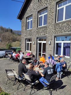 Nachdem alle fleißigen Helfer aus ihren "Revieren" zurückgekehrt waren, wurden sie bei strahlendem Sonnenschein auf der Terrasse unseres Gemeindehauses mit kühlen Getränken und leckeren Bockwürsten und Salaten von den Damen aus der Küche belohnt.