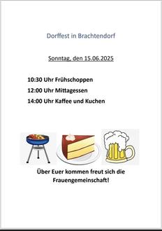 am Sonntag, den 15.06.2025 feiern wir wieder unser jährliches Dorffest. Unsere Frauengemeinschaft wird uns wie gewohnt bestens mit Essen und Trinken versorgen. Ich freue mich auf Euer Kommen.