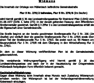 Gegen diese Widmung kann innerhalb eines Monats nach Zustellung Widerspruch erhoben werden. Der Widerspruch ist bei der Verbandsgemeindeverwaltung Kaisersesch einzulegen.