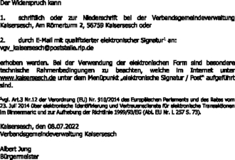 erhoben werden. Bei der Verwendung der elektronischen Form sind besondere technische Rahmenbedingungen zu beachten, welche im Internet unter www.kaisersesch.de unter dem Menüpunkt „elektronische Signatur / Post“ aufgeführt sind.
