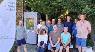 Der neue „Zeddinger Bücherschrank“ mit den Unterstützern, Edgar Kurtze vom Verein Dorfleben Zettingen e. V. und Philipp Scholz von „DVAG hilft e. V. - Menschen brauchen Menschen“ sowie das ehrenamtliche Team.