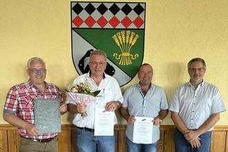 Im Anschluss verabschiedete Bürgermeister Albert Jung den ehemaligen Ortsbürgermeister Manfred Adams und überreichte ihm die Ehrenurkunde des Gemeinde- und Städtebundes Rheinland-Pfalz für seine 30-jährige kommunalpolitische Tätigkeit sowie eine Schieferplatte mit dem Wappen der Ortsgemeinde. Auch Frank Regnier erhielt die Ehrenurkunde des Gemeinde- und Städtebundes für seine 20-jährige kommunalpolitische Tätigkeit von Bürgermeister Albert Jung. Er dankte dem ehemaligen Ortsbürgermeister Manfred Adams sowie allen Ratsmitgliedern für die vertrauensvolle Arbeit in der Vergangenheit und wünschte dem neuen Ortsgemeinderat ein gutes Miteinander für eine positive Zukunft in Laubach sowie viel Freude im Amt.