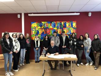 Die 11. Klasse der Fachoberschule Kaisersesch hatte am 08.01.2024 im Rahmen ihres Deutschunterrichtes mit den Lehrerinnen Anna Wißkirchen und Verena Wilhelmy die Möglichkeit, dem ehemaligen Lehrer, Schulleiter, Stadtbürgermeister und mehrfachem Buchautor zuzuhören, wie er Auszüge aus seinem neuen Buch vorstellte. Um die Schüler dort geographisch "abzuholen", wo das Buch seinen Ursprung fand, begann die Lesung mit einer Erklärung über den Verlauf des Jakobswegs und wichtigen Etappen. Im Anschluss hörten die Schülerinnen und Schüler der Erzählung von zwei ausgewählten Kapiteln gespannt zu, wie der Protagonist sich auf den Jakobsweg begab, um dort beim Wandern würdelose Erlebnisse seiner Schulzeit zu reflektieren, sodass die Würde wieder hergestellt werden sollte. Abschließend wurden dem Autor noch Schülerfragen wie "Wie ging es ihnen beim Wandern auf dem Jakobsweg" oder "Was hat sie am meisten beeindruckt"? gestellt, die Lutz gerne beantwortete. Das Fazit der Schüler fiel positiv aus: "Uns hat sein Vortrag gefallen!"
