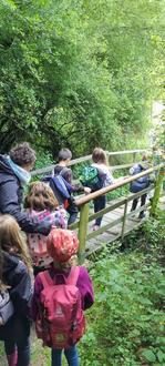 Die Kinder starteten hoch motiviert zu einer Wanderung Richtung Kaifenheim auf der Suche nach Raben. Für jeden gefundenen Raben auf dem Weg gab es zur Belohnung einen weiteren Teil der Geschichte „Glaube niemals einem Raben“. Es war ein aufregender Weg durch Felder, einen dunklen Tunnel über welchem die Autobahn verlief, einen dichten Wald, vorbei an einer Mühle, am Sportplatz, an Insektenhotels zur Bücherei nach Kaifenheim. Eine Mitarbeiterin der Bücherei begleitete die dynamische Gruppe, damit auch alle Raben gefunden wurden und weitere Mitarbeiter nicht umsonst an bestimmten Stellen standen, um das Rätsel um die Raben zu lösen. Selbstverständlich fand die pfiffige Truppe alle Raben, sowie auch den letzten Raben auf der Schatzkiste in der Bücherei, worin sich tolle Lutscher-Raben versteckten.