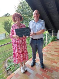 Ortsbürgermeister Thilo Schmitt gratulierte den Gastgebern Gabi und Reiner Weber herzlich zur Auszeichnung und überreichte im Namen der Ortsgemeinde Urmersbach zur Erinnerung eine Schiefertafel mit Widmung und Gemeindewappen.