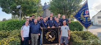 Gleich zwei gute Gründe gab es für ein Treffen unseres Junggesellenvereins am Kriegerdenkmal, zum ersten kam die verschollene Vereinsfahne von 1930 nach Hause und zweitens konnten wir endlich ein Bild von der Scheckübergabe an die Ortsgemeinde für die neue Jesusfigur auf unserem Friedhof machen. Aber der Reihe nach: Die Fahne vom JGV Masburg von 1930 war jahrzehntelang verschollen und wurde von Andi aus der Nähe von Bremen (links auf dem Bild) bei einem Internetportal gefunden und nach einer ausgiebigen Recherche, ob der Verein noch aktiv ist, kurzerhand von ihm erworben. Nach einigen E-Mails und Telefonaten wurde schnell ein Termin gefunden, wann er zusammen mit seinem Freund Reiner (rechts auf dem Bild), die Reise von Bremen nach Masburg angeht, um die Fahne „nach Hause“ zu bringen. Die Freude und Dankbarkeit von unserem Junggesellenverein war schon grenzenlos, aber Andi konnte diese nochmal steigern, indem er ganz selbstverständlich die Fahne unserem Junggesellenverein spendete.