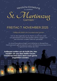 Unser diesjähriger Martinsumzug findet am Freitag, den 07.11.2025 statt. Wir treffen uns um 18:00 Uhr an der Grundschule Gamlen zum Laternenumzug durchs Dorf zum Martinsfeuer am Bürgerhaus. Begleitet wird der Umzug wie gewohnt von der FFW und dem Fanfarenzug Gamlen.