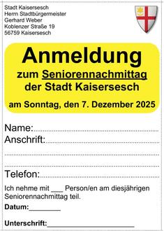 Um entsprechende Vorplanungen treffen zu können, melden Sie sich bitte über das unten beigefügte Anmeldeformular an. Einfach ausschneiden, ausfüllen und bis zum 30.11.2025 in den Briefkasten der Stadt Kaisersesch