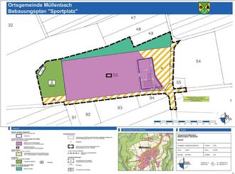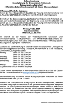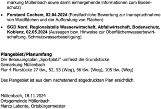Der Entwurf des Bebauungsplanes „Sportplatzes“ der Ortsgemeinde Müllenbach einschl. den textlichen Festsetzungen, der Begründung sowie dem Umweltbericht wird gemäß § 3 Abs. 2 Baugesetzbuch (BauGB) in der Fassung der Bekanntmachung vom 3. November 2017 (BGBl. I S. 3634) in der Zeit vom