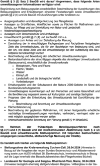 | • | Stellungnahme der Kreisverwaltung Cochem-Zell, 26.04.2024 (Hinweise in Bezug auf die Vorgaben der neuen Bundes-Bodenschutz- und Altlastenverordnung sowie zum ALEX-Infoblatt 28, Denkmalschutz, Immissionsschutz in Bezug auf die Lage innerhalb des Bauschutzbereiches des Fliegerhorstes Büchel) |