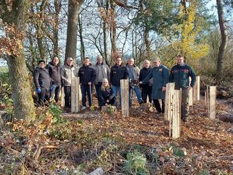 Da im Laufe des fast vergangenen Jahres leider einige Bäume entlang des Leienkauler Sportplatzes gefällt werden mussten, kam diese Aktion gerade recht, da die Ortsgemeinde ohnehin die entstandenen Lücken mit klimaresistenten Bäumen aufforsten lassen wollte. So wurden nun sieben Aufforstungsblöcke neben dem Sportplatzgelände bepflanzt und mit aufwendigem Verbissschutz versehen.