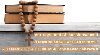 Am Dienstag, den 7. Februar 2023, 20:00 Uhr, findet im Mehrgenerationenhaus (MGH) Schieferland Kaisersesch, Bahnhofstraße 47, 56759 Kaisersesch, der Vortrags- und Diskussionsabend "Frauen ins Amt… – Weil Gott es so will" mit der Ordensschwester (Sr.) Philippa Rath statt.
