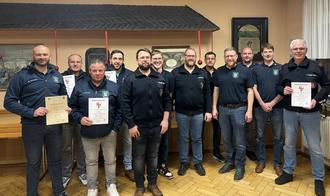 Wehrführer Daniel Hermes und sein Stellvertreter Johannes Klee bedankten sich bei Thomas Welter und Tobit Hermes, die im letzten Jahr in ihrer Freizeit Lehrgänge auf Kreisebene besucht hatten.
