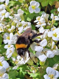 Das Frühlingserwachen: Eine Hummel auf weißen Blüten.