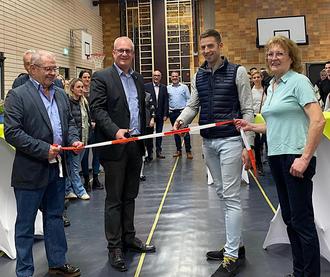 Mit dem traditionellen Durchschneiden eines Bandes haben Günter Loch, Erster Beigeordneter der Ortsgemeinde Kordel (l.), Bürgermeister Michael Holstein (2.v.l.) und Schulleiter Marco Bamberg (2.v.r.) und Beigeordnete Annerose Otten die Schulturnhalle Kordel offiziell ihrer Bestimmung übergeben.