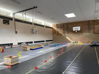 Blick in die Turnhalle Kordel mit aufgebautem Bewegungsparcours.