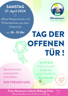 Am Samstag, den 27. April von 10 bis 15 Uhr öffnen sich die Türen zum zweiten Mal in der Maria-Kundenreich-Straße 4 in Bitburg. Wie auch im letzten Jahr können alle Besucher die Montessori-Pädagogik hautnah bei spannenden Präsentationen aus dem Unterricht erleben, Fragen direkt und persönlich besprechen, die Klassenräume besichtigen, interessante Gespräche führen und die Schule kennenlernen.