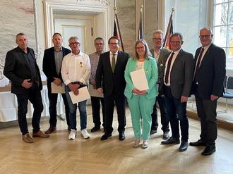 v.l.n.r. Alfred Wirtz (Ortsbürgermeister Ralingen), Michael Hurt, Heinz-Werner Lay (Ortsvorsteher Ralingen), Wolfgang Keilen, ADD-Präsident Thomas Linnertz, Claudia Thielen (Ortsbürgermeisterin Aach), Ralf Kierspel (1. Beigeordneter Aach), Stefan Metzdorf (Landrat Trier-Saarburg), Michael Holstein (Bürgermeister VG Trier-Land)