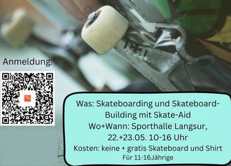 Ein Skateboard bauen-Skaten-Tricks versuchen uvm. erwarten dich in unserem Skateboardworkshop in bzw. hinter der Sporthalle Langsur. Am 22. und 23.05. von 10-16 Uhr kannst du mit den Profis von Skate-Aid deine eigenen Skate-Skills entwickeln. Dank des Sponsoring von Westenergie ist das Ganze für dich sogar kostenlos. Zudem darfst du dein gebautes Skateboard umsonst mit nach Hause nehmen und bekommst sogar noch ein Shirt obendrauf. Verpflegung ist ebenfalls inklusive. Für mehr Infos und die Anmeldung scanne den QR-Code oder besuche unsere Webseite jugendpflege-trier-land.de und schaue unter der Rubrik Jugend – Freizeitangebote nach.