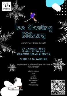 Die Jugendpflege Trier-Land lädt am 27.01.2024 in die Eissporthalle Bitburg zur Disko Eiskalt ein. Dafür haben wir einen Bus organisiert, der euch aus den Ortsgemeinden Aach, Beßlich, Butzweiler, Newel und Welschbillig abholen kommt und wieder zurückbringt. Wir starten um 17 Uhr in Trier. In der Eishalle angekommen, könnt ihr euch bis 22 Uhr austoben. Anschließend werden wir uns wieder auf den Rückweg machen und euch zur Haltestelle zurückbringen. Eine Teilnahmegebühr von 9 Euro fällt an. Darin enthalten sind Busfahrt und Eintritt.