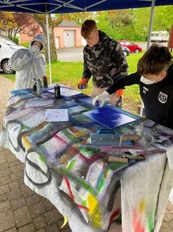 Trotz des unbeständigen Wetters, das zeitweise Regen und Hagel brachte, konnte der Workshop erfolgreich durchgeführt werden. Zwar war es aufgrund der Wetterbedingungen nicht möglich, eine Außenfläche zu besprühen, jedoch erwies sich der Leinwandworkshop als voller Erfolg!