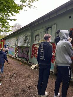 Nach einer kurzen Einführung und der Ideenfindung machten sich die Jugendlichen an die ersten Skizzen, um ihr Motiv dann anschließend auf die Wand zu sprühen. So konnten die Teilnehmenden ihre Visionen klar formulieren und nachfolgend umsetzen.