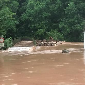 Zemmer-Daufenbach – Die Radbrücke an der Deimlinger Mühle konnte den Fluten nicht standhalten. Noch konnte sie nicht neu errichtet werden. Schwer getroffen wurden auch die Orte Daufenbach und das Mühlenflürchen.