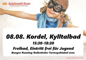 Bungee Running, Rollenbahn, das Turmspektakel und mehr erwarten euch bei der mobilen Spielaktion in Kordel. Im dritten Jahr in Folge kooperieren die Jugendpflege, das Kylltalbad und das Spielmobil Konz um euch einen schönen Nachmittag im Freibad zu ermöglichen. Wichtig: Ab 14 Uhr ist der Eintritt für alle unter 18-Jahren kostenlos. Wir freuen uns auf euch!