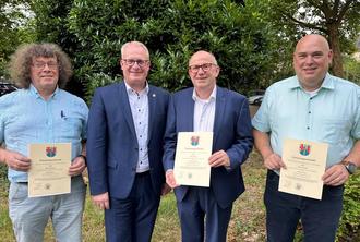 Bürgermeister Michael Holstein (2.v.l.) überreichte den Beigeordneten die Ernennungsurkunden: Dieter Müller (2.v.r.) bekleidet in der Legislaturperiode 2024 - 2029 das Amt des Ersten Beigeordneten. Die weiteren Beigeordneten sind Marcel Keilen (r.) und Roald Andersen (l.).