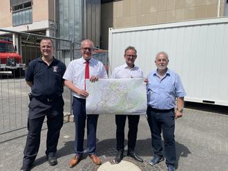 Um die Bevölkerung auch künftig effektiv warnen zu können, wurde zum Jahrestag der Flut in Kordel die erste neue Warnsirene im Kreis Trier-Saarburg in Betrieb genommen. Landrat Stefan Metzdorf ließ sich gemeinsam mit Bürgermeister Michael Holstein sowie dem Kordeler Ortsbürgermeister Medard Roth die Technik und Warnmöglichkeiten erklären.