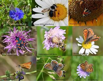 Wer genau hinsieht, kann in unseren Wiesen kleine Wunderwerke der Natur entdecken. Wir danken Gerda Kohn (Russischer Bär), Inge Willert (Hauhechel-Bläuling), Simone Schiffels (Rotes Widderchen) und Peter Brixius (Dickkopffalter, Sonnenröschen, Mauerfuchs, Kleiner Feuerfalter, Kabenspinne mit Beute, Grau Düster-Sandbiene).