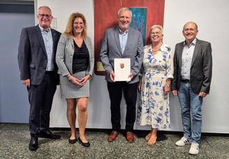 Dem Jubilar (Mitte) gratulierten Bürgermeister Michael Holstein (l.), Dr. Simone Konz, Direktorin des Amtsgerichts (2.v.l.), Schiedsfrau Lilo Fohl (2.v.r.) und Matthias Wagner, Vorsitzender des Bund Deutscher Schiedsmänner und Schiedsfrauen e.V. - Landesvereinigung Rheinland-Pfalz. Mit den Glückwünschen verbunden war der Dank für sein herausragendes Engagement nicht nur als Schiedsmann, sondern auch für sein langjähriges kommunalpolitisches Engagement auf Ortsgemeinde- und Verbandsgemeindeebene.