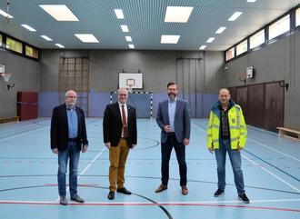 Begutachteten vor Ort die neue LED-Innenbeleuchtung in der Turnhalle in Trierweiler. Von links: Ortsbürgermeister Dieter Müller, Bürgermeister Michael Holstein, Christian Nathem (Westenergie) sowie Andreas Traumann (VG).