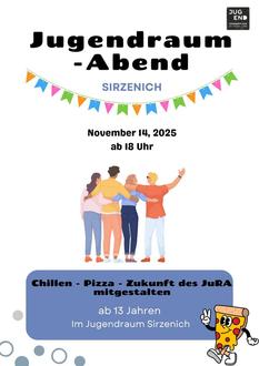 Egal ob einfach entspannen, zocken oder mitentscheiden, wie der Jugendraum in Zukunft aussehen soll – du hast die Wahl! Was soll da rein? Welche Ausstattung fehlt? Deine Ideen sind gefragt! Also, schnapp dir ein Stück Pizza und sei dabei. Du kannst gerne auch einfach zum gemeinsamen Beisammensein vorbeikommen. Wir freuen uns auf dich!“