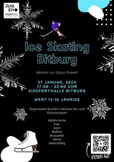 Die Jugendpflege Trier-Land lädt am 27.01.2024 in die Eissporthalle Bitburg zur Disko Eiskalt ein. Dafür haben wir einen Bus organisiert, der euch aus den Ortsgemeinden Aach, Beßlich, Butzweiler, Newel und Welschbillig abholen kommt und wieder zurückbringt. Wir starten um 17 Uhr in Trier. In der Eishalle angekommen, könnt ihr euch bis 22 Uhr austoben. Anschließend werden wir uns wieder auf den Rückweg machen und euch zur Haltestelle zurückbringen. Eine Teilnahmegebühr von 9 Euro fällt an. Darin enthalten sind Busfahrt und Eintritt.