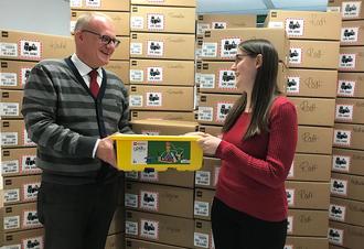Bürgermeister Michael Holstein und VG-Mitarbeiterin Alina Leitzgen schauen sich die Lernsets vor der Auslieferung an die Grundschulen an.