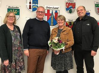 Nahezu zwölf Jahre lang war Margot Schilling „erste Anlaufstelle“ in der Verbandsgemeindeverwaltung Trier-Land, denn seit März 2012 versah sie ihren Dienst in der Zentrale des Rathauses. Neben dem zentralen Telefondienst zählten auch der Posteingang und die Rechnungserfassung zu ihren Aufgaben. Mit Erreichen der Altersgrenze verabschiedete sich Margot Schilling aus dem Dienst. Für ihren weiteren Lebensweg wünschten ihr Bürgermeister Michael Holstein (2.v.l.), Büroleiterin Gabi Thebach (l.) und Personalratsvorsitzender Armin Hunsicker alles Gute.