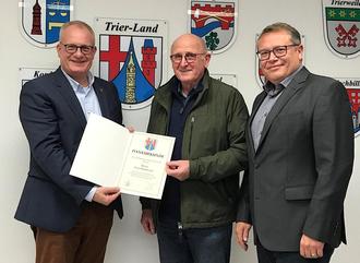 Auch für Ernst Hoffmann endete die Zeit bei der Verbandsgemeinde Trier-Land. Der „Mann für alle Fälle“ übernahm nach Eintritt in den Ruhestand eine Nebenbeschäftigung bei der Verbandsgemeindeverwaltung Trier-Land. Seit 2020 erledigte er eine ganze Palette an kleineren Reparatur- und Instandhaltungsarbeiten sowie die Pflege der Außenanlagen. Alles Gute für die Zukunft wünschten ihm Bürgermeister Michael Holstein (l.) und Sachgebietsleiter Torsten Petry (r.).