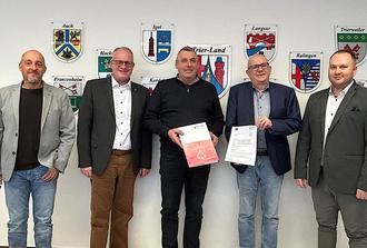 Die Projektpartner freuen sich über die Zuwendungen aus dem EFRE-Fördercall. Unser Bild zeigt von links nach rechts: Jürgen Feltes, Leiter FB Bauen, Bürgermeister Michael Holstein, Ortsbürgermeister Alfred Wirtz, Ortsbürgermeister Dieter Müller und Projektleiter Sven Maier.