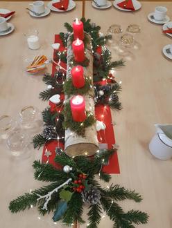 Die Tische waren festlich mit Holzstämmchen und Kerzen, Lichterketten, Tannen, roten Beeren, Moos, Tannenzapfen und Christbaumkugeln geschmückt. Viele Aktive waren der Einladung gefolgt und so konnte Karla Kroon alle herzlich begrüßen. Zunächst gab es zum Anstoßen für alle ein Glas Sekt. Zum Kaffee wurden von den Helferinnen super leckere Kuchenvariationen gereicht. Vielen herzlichen Dank an alle Helfer, die jeden Monat tatkräftig anpacken, damit wir diese Treffen organisieren können.