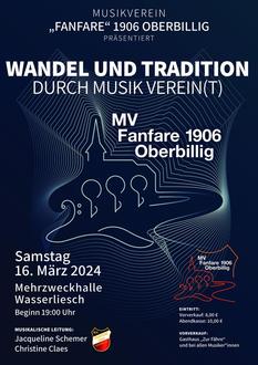 Der Musikverein “Fanfare” 1906 Oberbillig veranstaltet sein jährliches Frühjahrskonzert am Samstag, 16. März 2024 um 19 Uhr in der Mehrzweckhalle in Wasserliesch. Unter dem Motto “Wandel und Tradition - durch Musikverein(t)” erwartet Sie ein abwechslungsreiches Programm aus bekannten Film- und Popmelodien, als auch sinfonische Werke und traditionelle Blasmusikliteratur unter der neuen, musikalischen Leitung von Jacqueline Schemer. Auch das Jugendorchester wird mit einem tollen, vielfältigen Programm unter der Leitung von Christine Claes seine Leistung präsentieren. Sie dürfen sich auf einen kurzweiligen Abend freuen!